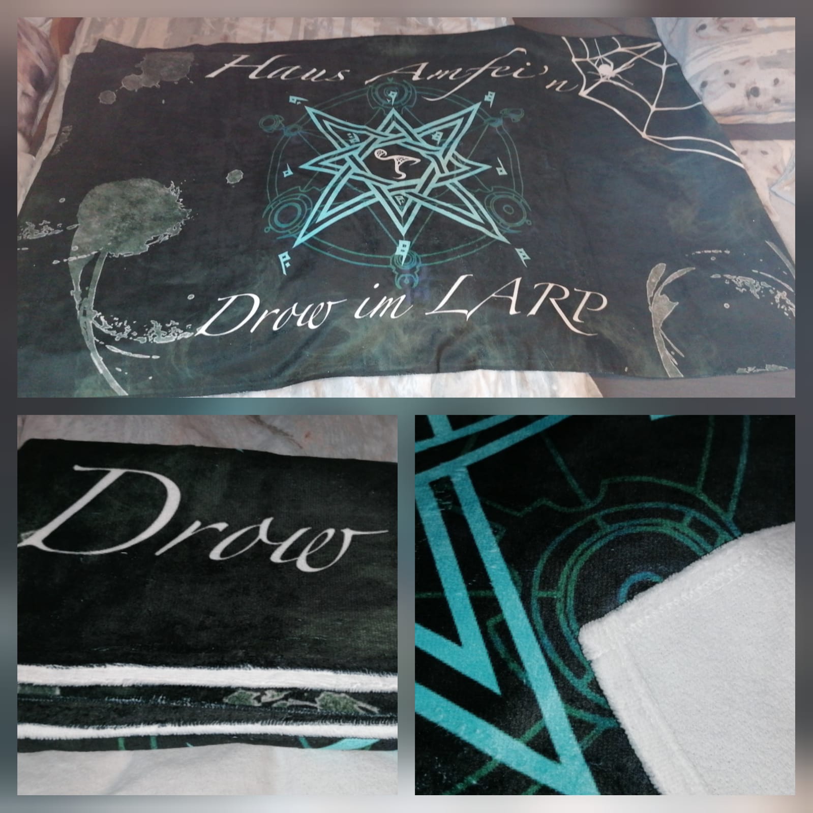 Wir sind eine LARP-Gruppe, die liebt, was sie tut. Daher ist auch das Bedürfnis, uns im OT mit dem Gruppendesign zu umgeben, immer weiter gestiegen, sodass neben Gruppen-Hoodies und Shirts nun auch noch ein Badetuch entworfen wurde. Wenn ihr Interesse habt, ganz gleich, um welches Gruppenprodukt es sich handelt, wendet euch vertrauensvoll an die Orga!